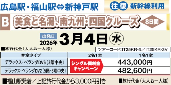 • 出発地 / 広島駅・福山駅~新神戸駅/神戸港(※各自で神戸港へ移動)