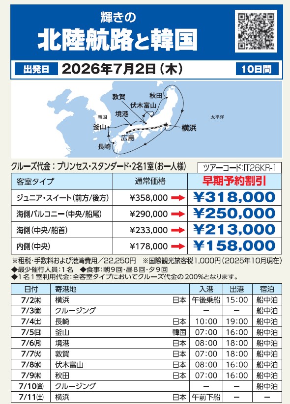 7月2日発『輝きの北陸航路と韓国10日間』