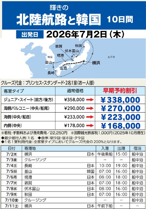 ■旅行代金の他、租税・手数料および港湾税22,250円(暫定価格)、国際観光旅客税1,000円が別途必要となります。