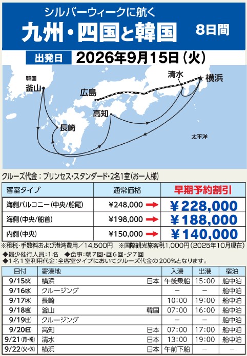 ■ご旅行終了時から有効期間が6ヵ月以上残っている旅券(パスポート)をご用意ください。 ※査証(ビザ)について/日本国籍の方は、査証の取得は不要です。 ※日程・寄港時間などは天候・港湾の事情により予告なく変更される場合があります。 ※チップ「クルー・アプリシエーション」1名1泊あたり ジュニア・スイート客室は18米ドル、その他の客室は17米ドルが船内会計に自動的にチャージされます。料金は予告なく変更になる可能性があります。プリンセス・プレミアおよびプリンセス・プレミアでお申込みの場合はチップ代金が含まれます。 ※乗船手続き(オンラインチェックイン)、メインダイニングでの夕食時間の予約、各寄港地観光のご予約手配代行手数料1件のご依頼につき3,000円(税込)予約代行サービスとなります。予約を確約するものではありません。 |