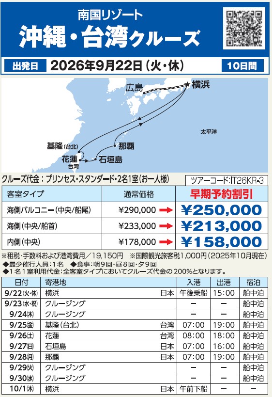 ■添乗員は同行しません。 ■ご旅行終了時から有効期間が6ヵ月以上残っている旅券(パスポート)をご用意ください。 ※査証(ビザ)について/日本国籍の方は、査証の取得は不要です。 ※日程・寄港時間などは天候・港湾の事情により予告なく変更される場合があります。 ※チップ「クルー・アプリシエーション」1名1泊あたり ジュニア・スイート客室は18米ドル、その他の客室は17米ドルが船内会計に自動的にチャージされます。料金は予告なく変更になる可能性があります。プリンセス・プレミアおよびプリンセス・プレミアでお申込みの場合はチップ代金が含まれます。 |
